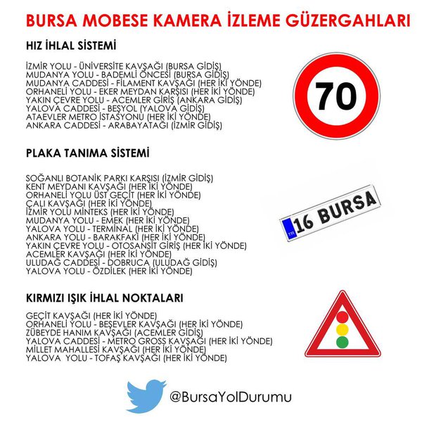 2015 Ağustos'tan beri Bursa'da yaşıyoruz. Twitter'da @BursaYolDurumu hesabını takip ediyorum. Bu hesapta Bursa'daki yol durumları diğer Twitter kullanıcılarının twitleri RT yapılarak anlık olarak veriliyor. Bunun yanında hiç tasvip etmesem de nerede radar var, nerede çevirme var onlardan da haberdâr olabiliyorsunuz. Ancak bunu herkes radar ve çevirme var diye söylemiyor da komik ve şifreli bir şekilde yazıyor. Bunlardan bazılarını aşağıya eklemek istedim.